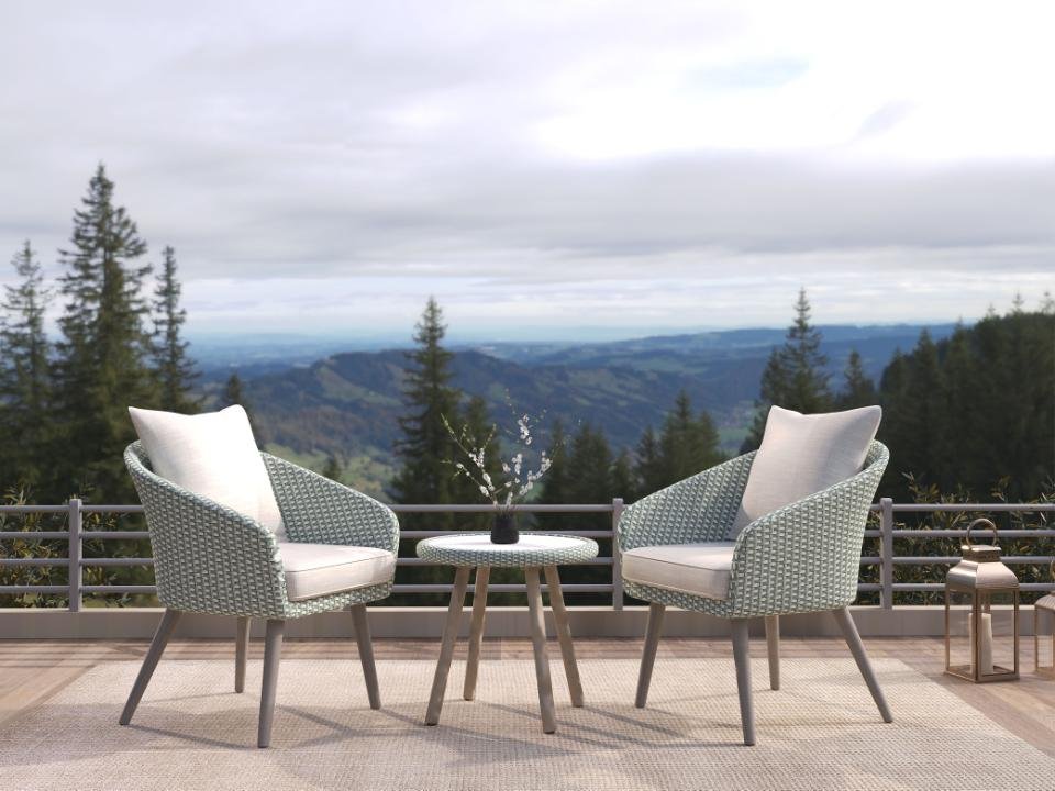 Korsika cafésæt, m. 1 bord, 2 stole, hynder - varm grå rattan og aluminium